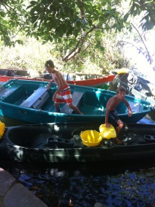 The boats were a huge draw with the kids, so we finished up our tour and headed straight toward the kayaks and rowboats. Erin and Ben opted for a 2 person kayak and Abby, Jacob and I hopped in the row boat. To our surprise, one of the men that worked at the island got in the boat with us and started rowing the 4 of us out. Cool! A guided tour. He proceeded to take us on a 90 minute row boat tour of the islands nearby, telling me about the birds, flowers and trees in the area (all in spanish). Erin and Ben followed along in the kayak behind us. Needless to say, it was beautiful.
