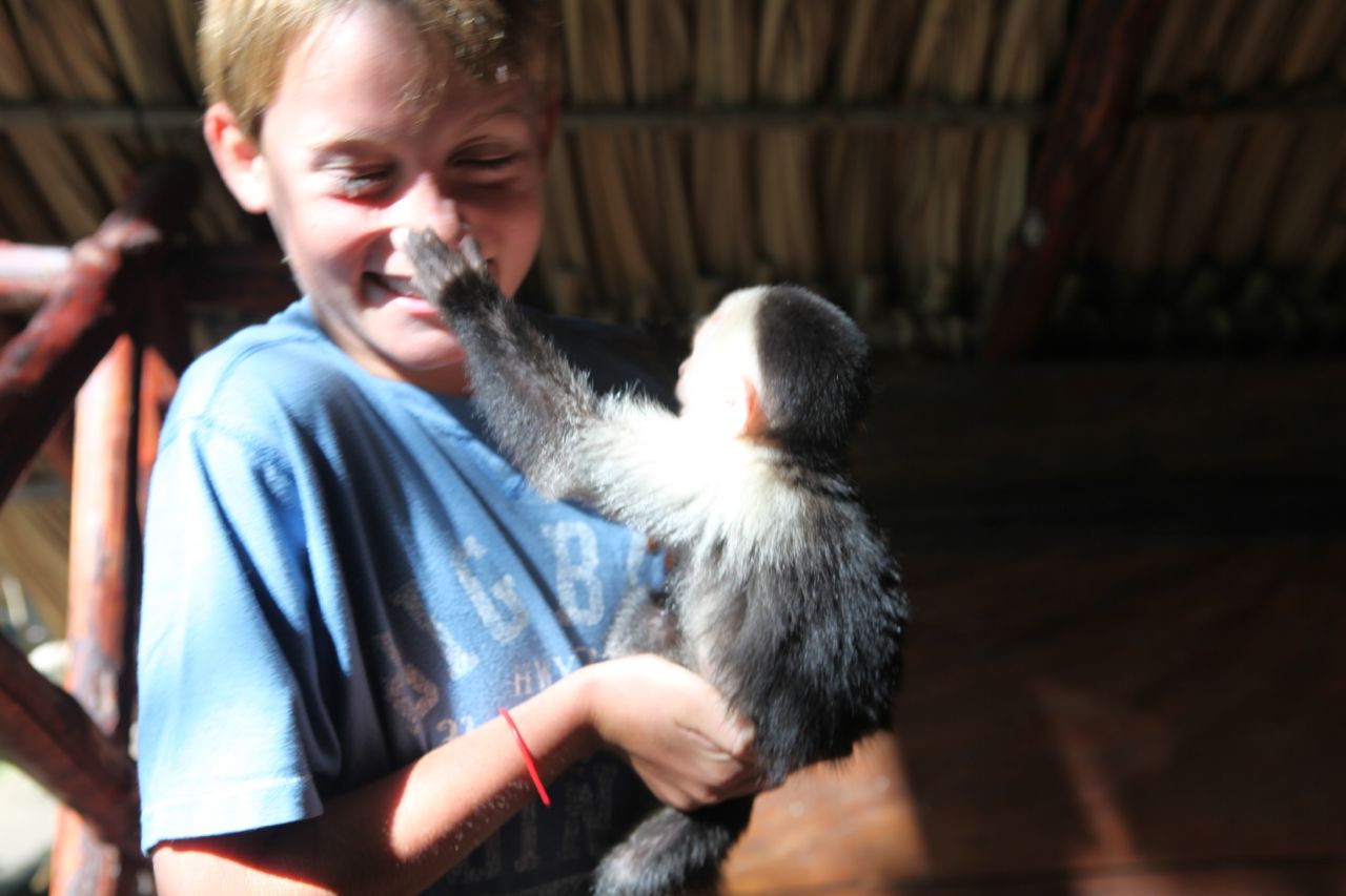 Post lunch, we were introduced to the resident monkey on the Island, Cashew. He was a young capuchin monkey and adorable. He reminded me of being with a toddler. Totally out of control, needing attention and entertainment around every corner. He really liked my camera (see the video) and was really fun to play with. All of the kids played with Cashew, though Abby screamed every time he jumped on/near/around her 🙂
