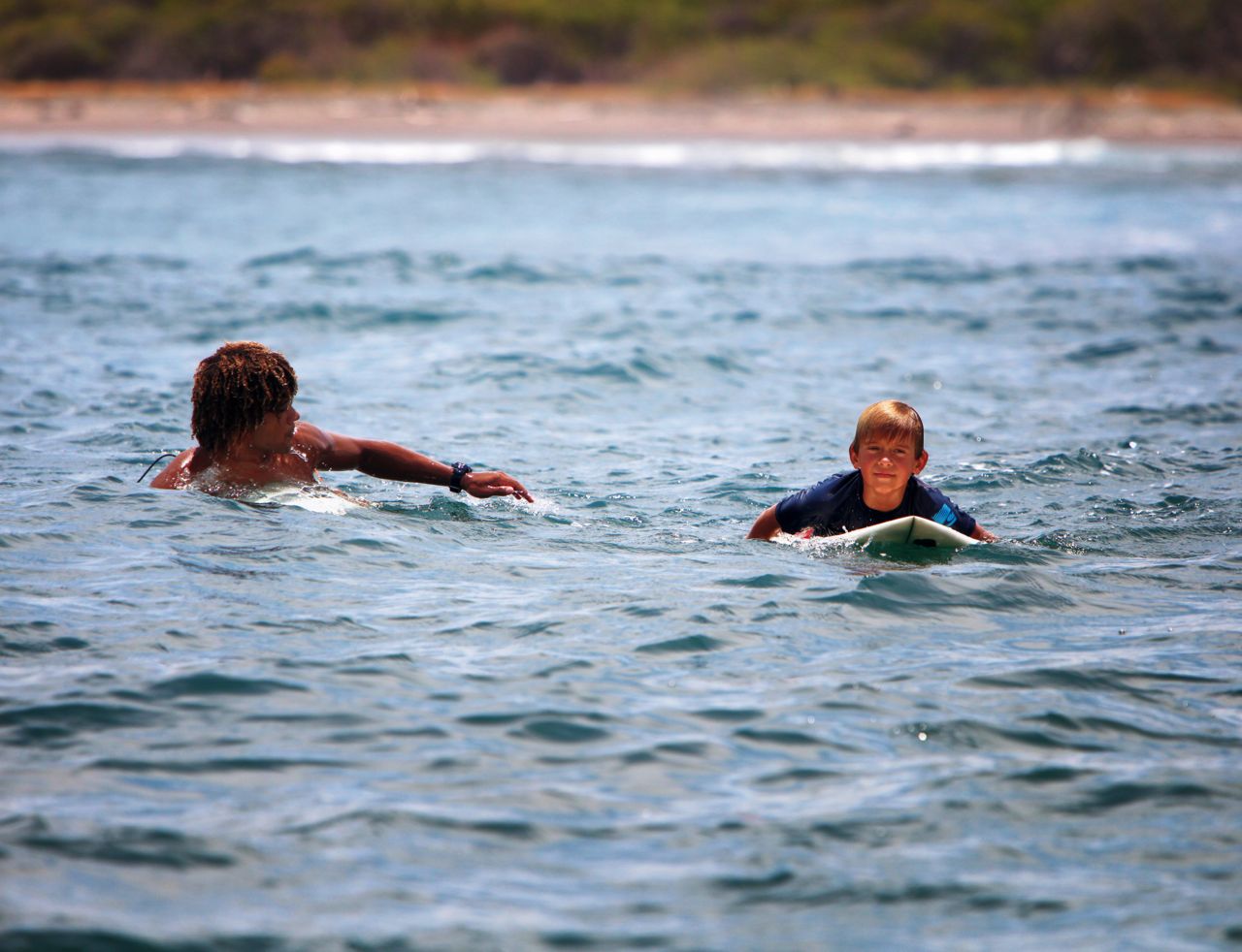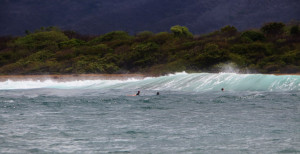 We stayed on the outer set for a short while, but Jacob and I headed toward the beach when we got a break. Before long, we all found our spot – Brian and Omar were catching the big waves, Ben was hanging somewhere in the middle, Jacob and I headed for the milder beach break. A couple of times, I would leave Jacob near the beach to check on Ben. There were lots of eyes – Rick and Matt with binoculars from the boat, Omar and Brian in the water near Ben, and me, paddling between the two boys, unable to see both at the same time.