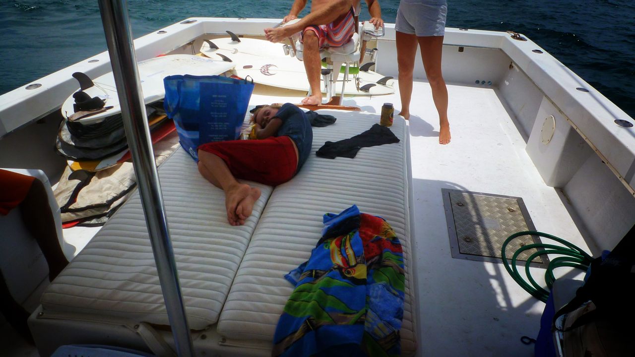 While a big part of this post, that was only a small part of our day. We took a deep breath and then motored another 20 minutes north to Ollie’s point. Ben, Brian and Matt jumped off the boat and swam to this awesome point break – totally empty and just starting to break. Abby and I swam, Omar relaxed and Jacob shook off his shock. By the time Matt returned to the boat, Jacob was ready to jump back in and go for it. Ollie’s did not require any paddling through the break, so Brian, Jacob and Ben spent the next hour plus taking turns catching nice, long rides – one after another. The boys were so happy, taking every little piece of surf advice they could gather from Brian. Matt, Omar, Abby and I enjoyed the hour taking pictures, swimming and relaxing on the boat.