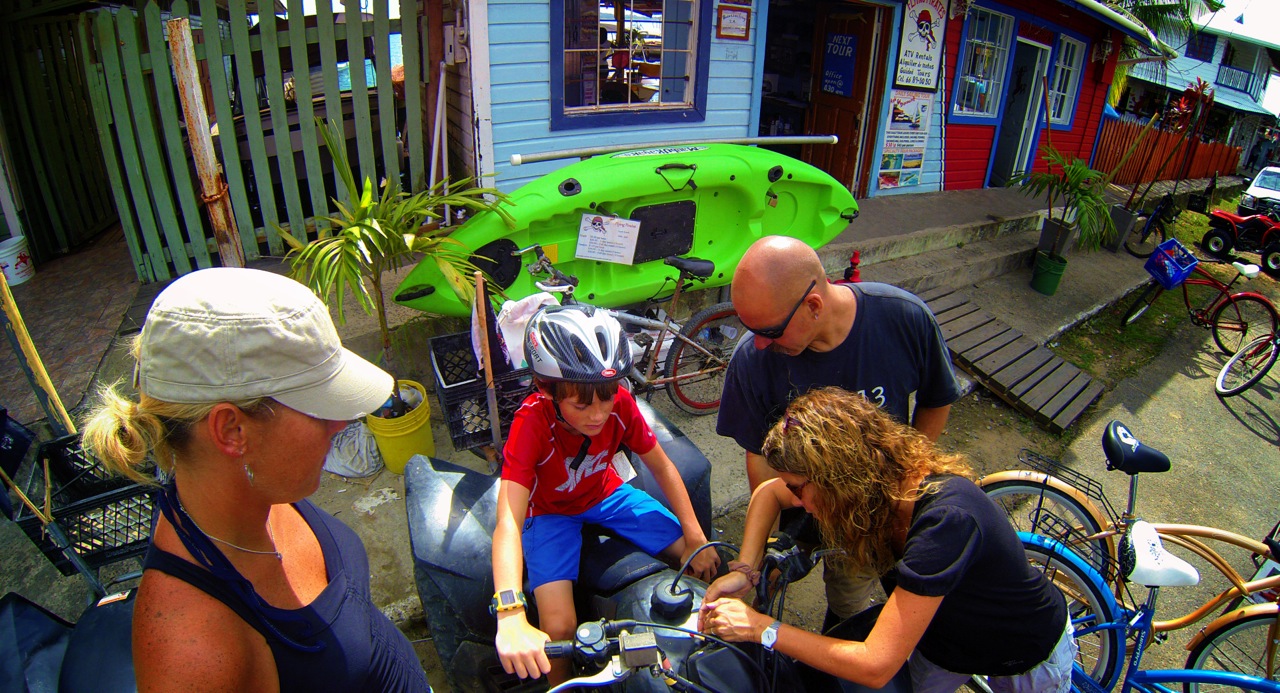 I towed Ben, Jacob rode on my ATV with me, and Abby rode with Erin. We drove through Bocas Town and got familiar with our new toys. A few times along the ride, the pin came out on our tow hitch, so we had to stop and perform repairs. I finally got the pin fixed and bent back into place after it popped out three or four times, and from then on out it worked perfectly.