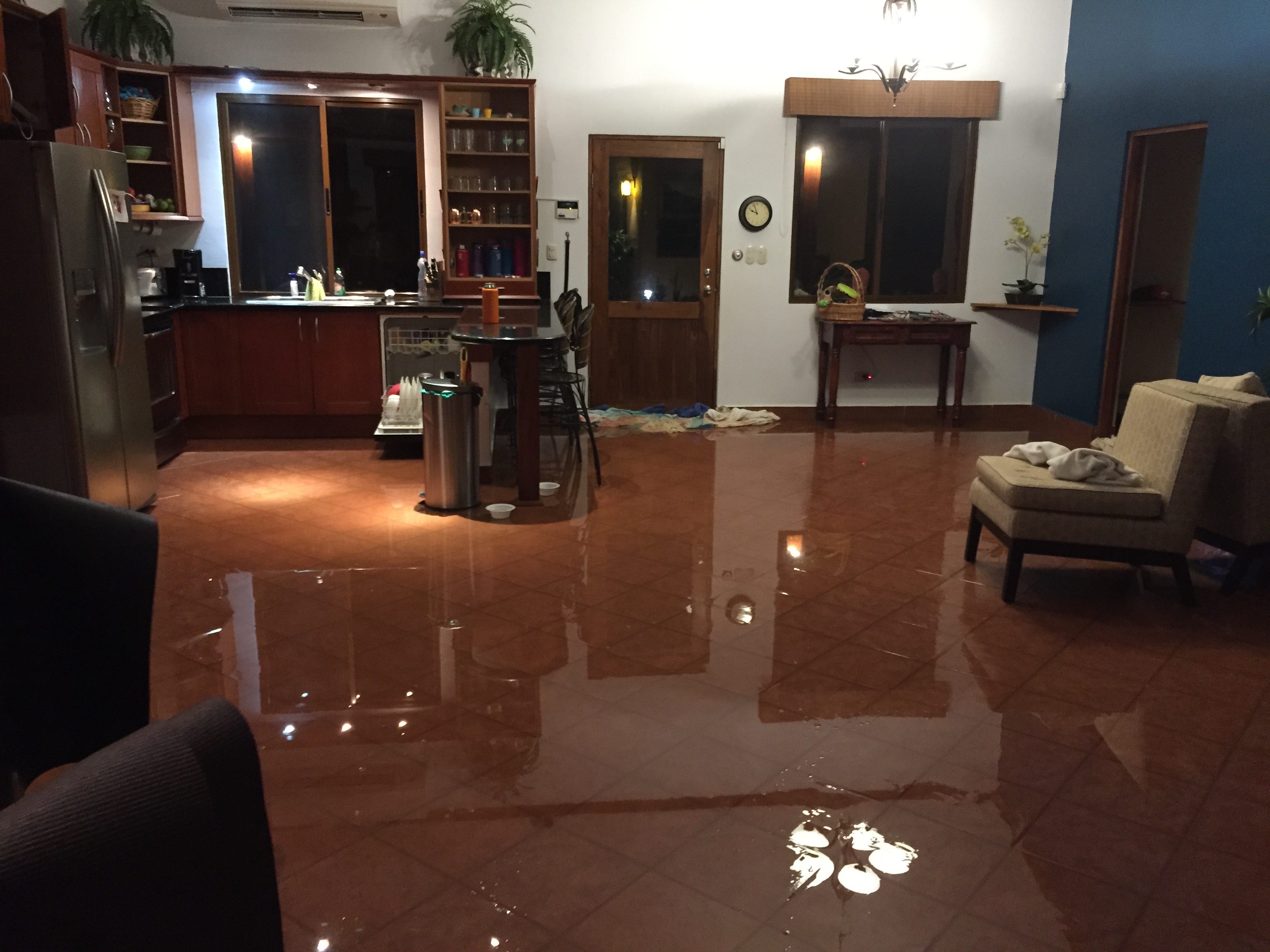 In the end, we ended up with about 2-3 inches of standing water in the house, but it all worked out fine. Erin and I stayed up late pushing the water out the back door with brooms and anything else we could find. By the time we went to bed at 1 am, the rain had stopped, the flooding had stopped and the floor was already starting to dry.