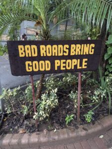 One dinner out at Lagarta Lodge provided another memorable moment. The rain let up briefly, allowing the group to soak in the breathtaking view where jungle meets ocean. The lodge’s sign, “Bad roads bring Good people,” seemed written for our week. And, as we joked later, bad weather apparently does the same.